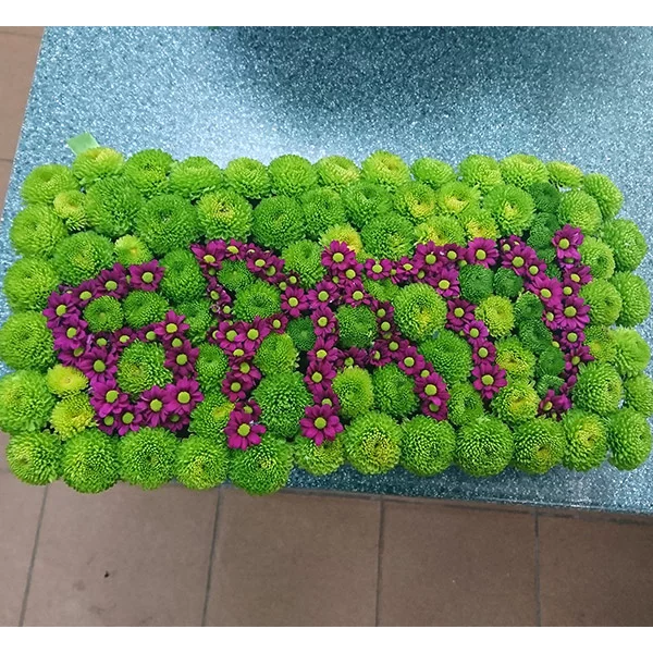 Стандартный: хризантема кустовая зеленая (сантини) - 20 шт., хризантема кустовая фиолетовая - 9 шт., оазис.