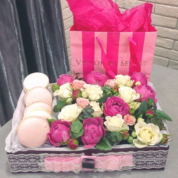 Доставка данной композиции возможна только по России! Возможна замена макарунов на зефир или конфеты Raffaello. Дизайн коробки может отличаться от картинки! Просим оформлять данный вид композиции заранее