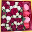 Уменьшенный: роза кустовая розовая - 2 шт., роза кустовая белая - 1 шт., макаруны (возможна замена на зефир), декор, оазис, коробка малая.