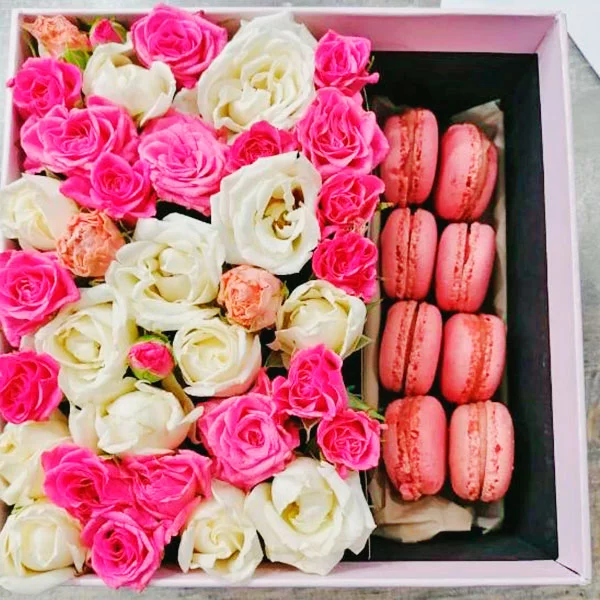 Люкс: роза кустовая розовая - 10 шт., роза кустовая белая - 7 шт., макаруны (возможна замена на зефир), декор, оазис, коробка большая.