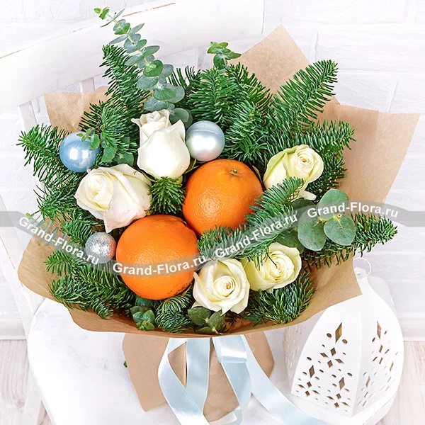 Стандартный(на фото): роза белая - 5 шт., апельсин - 2 шт., шарики - 3 шт., ель, эвкалипт, упаковка крафт, лента.